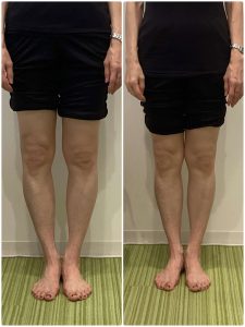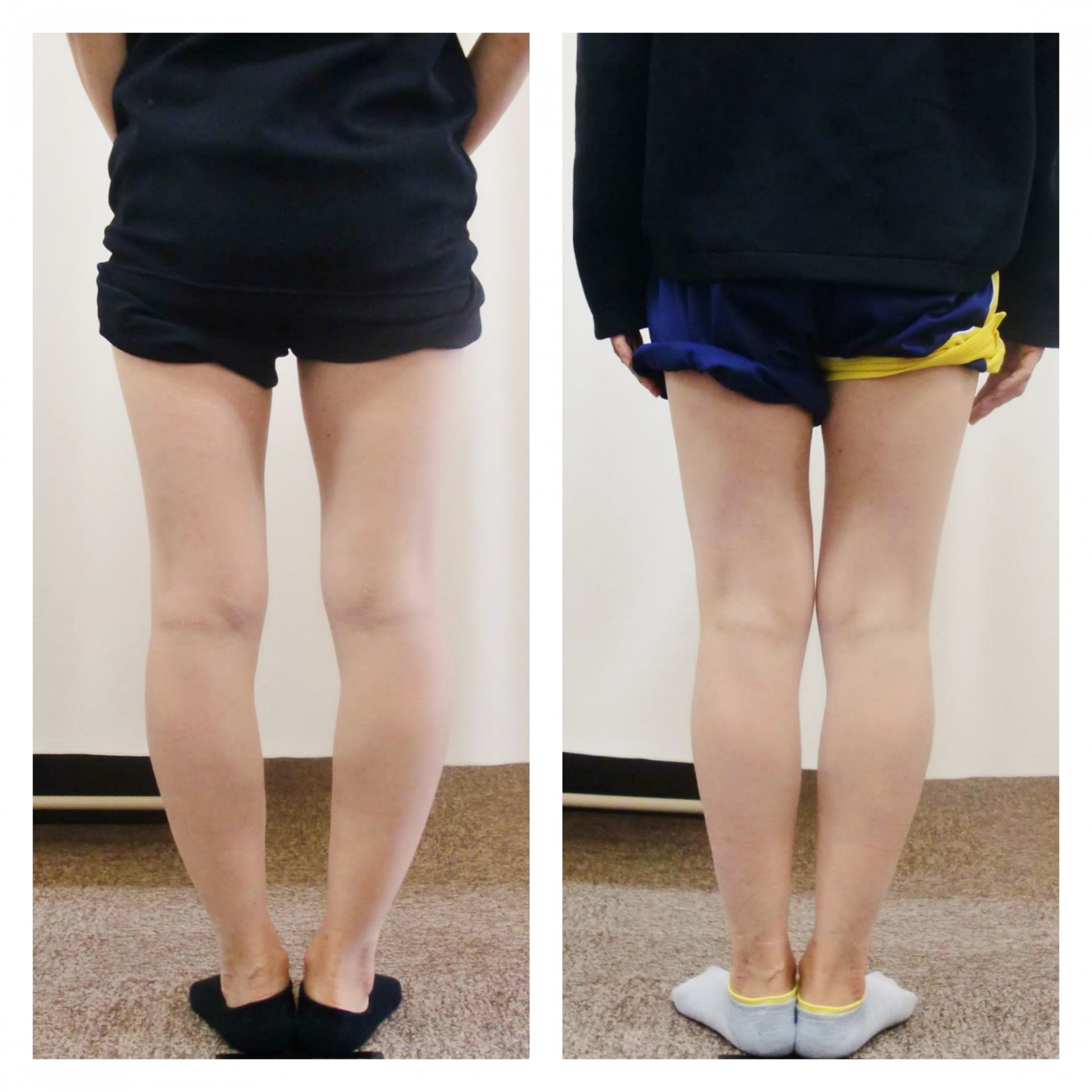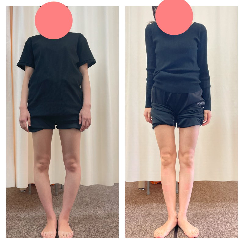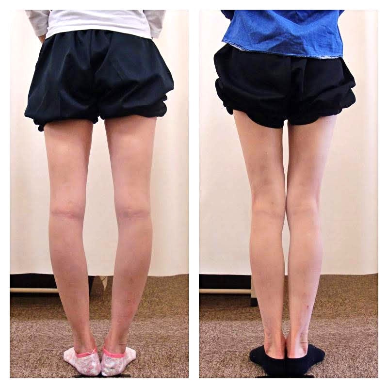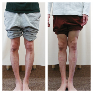 施術前後の写真を撮影し、膝と膝の間の距離を計測することで、変化が一目瞭然。